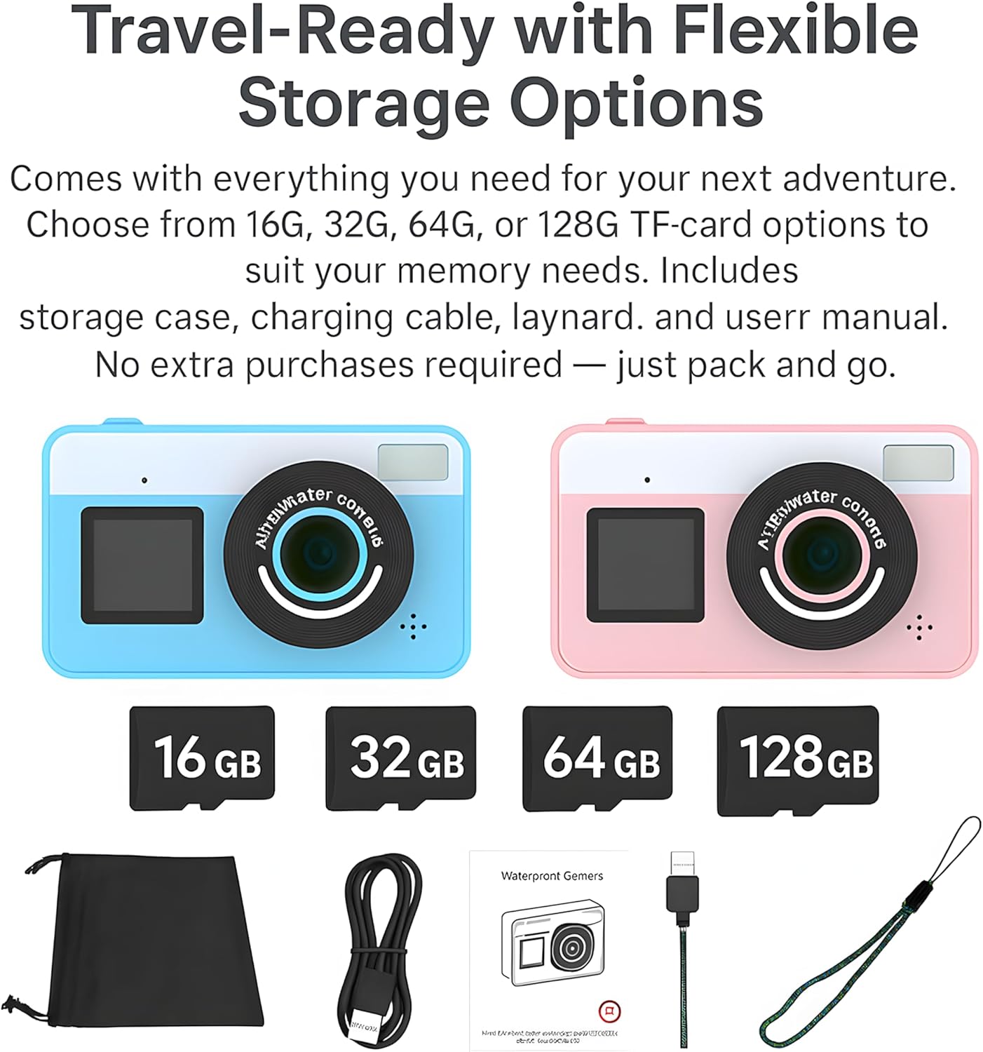 Capture memories that last a lifetime with this fun and easy-to-use waterproof camera—perfect for families, kids, teens, and travel lovers. Whether you're swimming in the pool, snorkeling at the beach, or kayaking on the lake, this camera is built for every adventure. It’s waterproof up to 10 feet (3 meters) and designed with a dual-screen system, so you can take selfies or group shots with ease. Record beautiful 4K videos or snap clear 48MP photos without any complicated setup—just point and shoot. Built-in features like smart autofocus, a fill light for low-light conditions, and 18X zoom ensure your pictures look great no matter where you are. With four storage options (16GB, 32GB, 64GB, or 128GB), you can choose the right memory size for your needs. It also comes with everything you need to start: a rechargeable battery, wrist strap, USB-C cable, and a handy travel pouch. Compact, lightweight, and gift-ready, this camera is a great surprise for birthdays, holidays, or your next vacation.